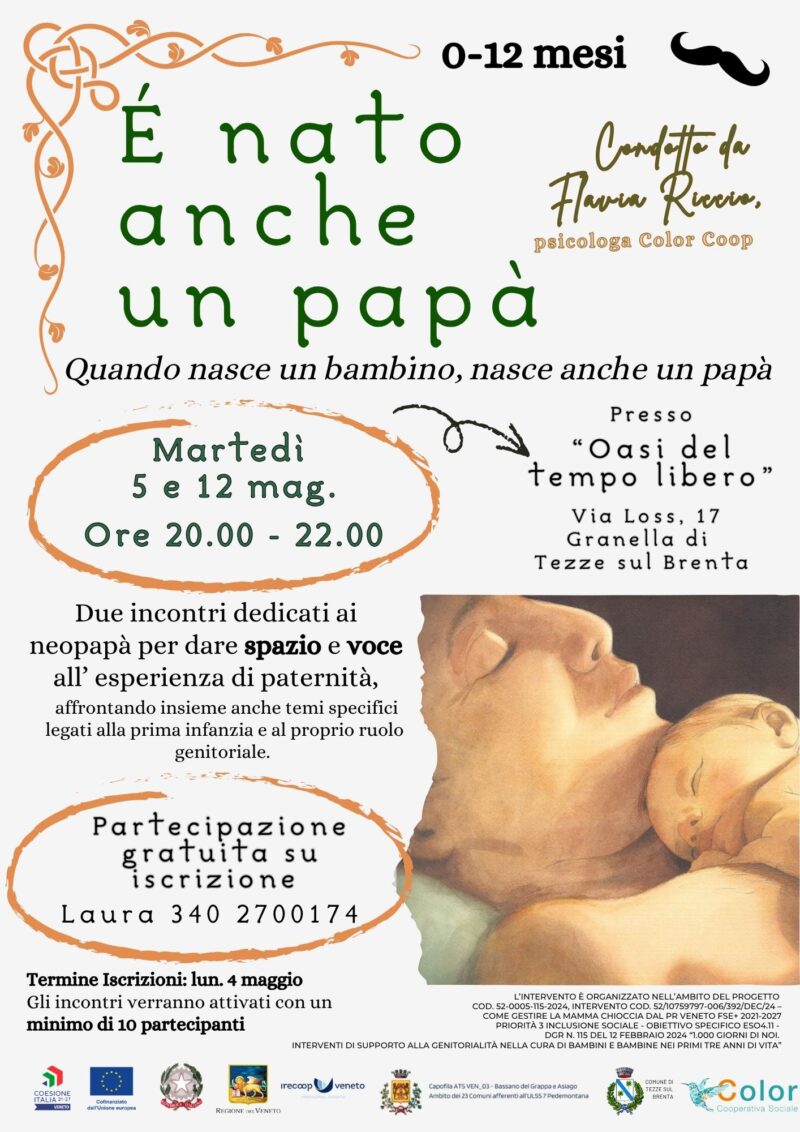 Quando nasce un bambino, nasce anche un papà Due incontri dedicati ai neopapà per dare spazio e voce all’ esperienza di paternità affrontando insieme anche temi specifici legati alla prima infanzia e al proprio ruolo genitoriale. Partecipazione gratuita su iscrizione. Per info: Laura: 340.2700174